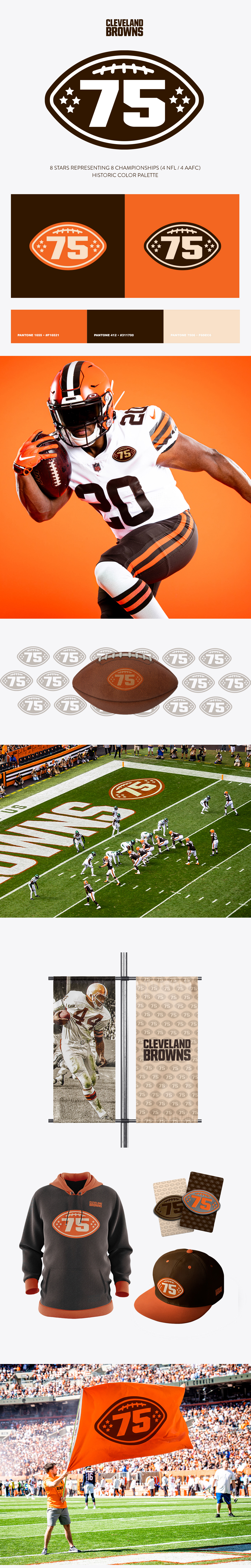 An exploration of the Cleveland Browns' 75th anniversary logo design, highlighting its use cases and merchandising opportunities